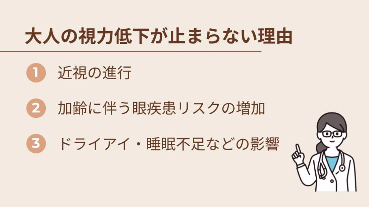 「大人の視力低下が止まらない」という悩みは、決してあなた一人だけのものではありません。加齢やライフスタイルの変化により、誰にでも起こりうることなのです。