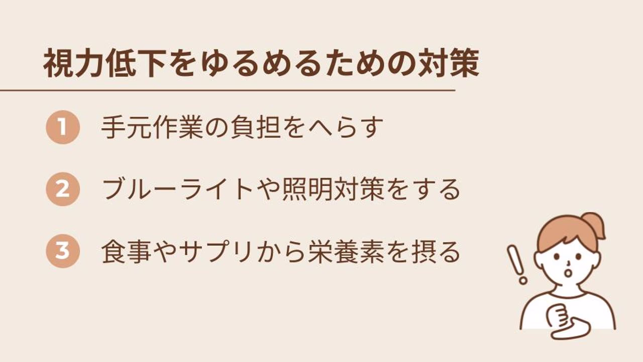 まずは、パソコン作業の合間に遠くを眺めたり、目に良い栄養素を意識した食事を心がけたりと、今日からできることから始めてみてはいかがでしょうか。