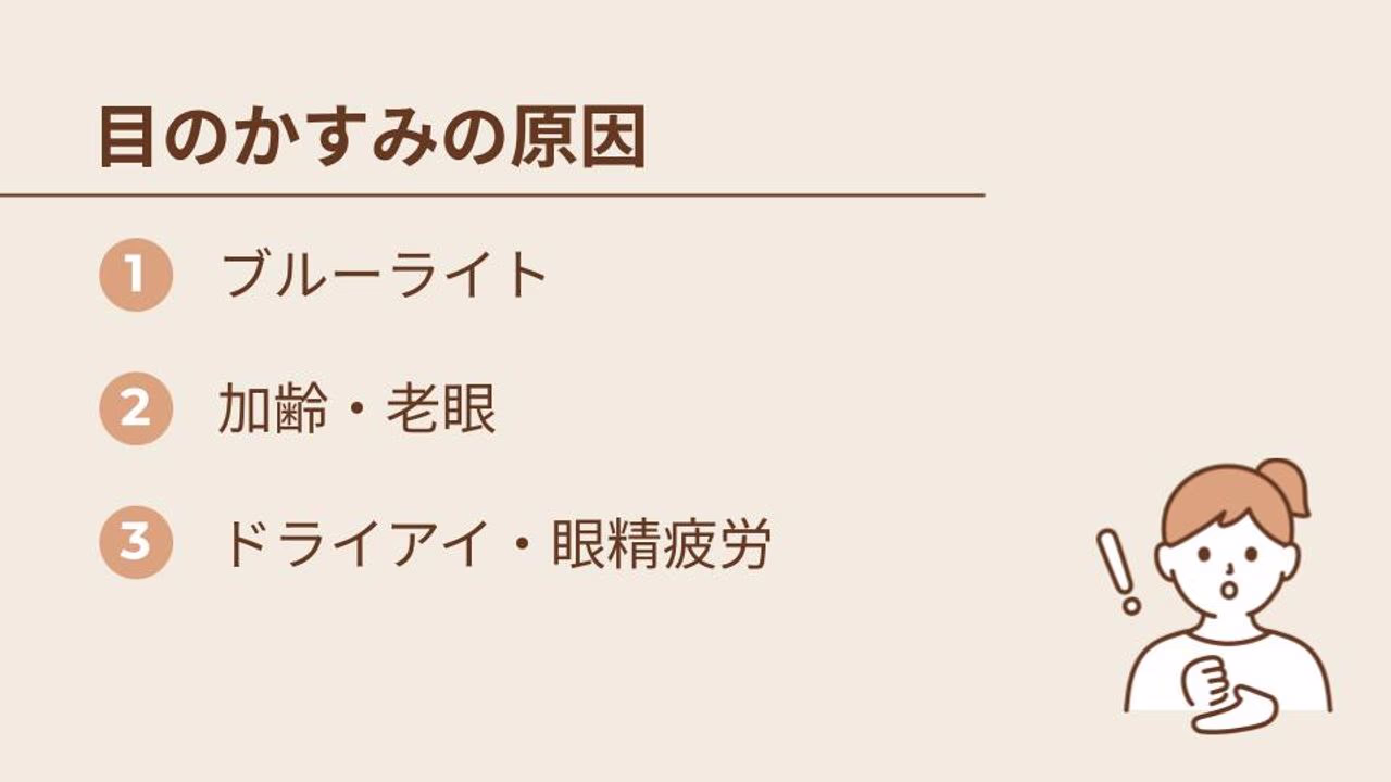 目のかすみの原因は、長時間のデスクワークで浴びるブルーライト、年齢によるピント調節機能の衰え、そして目の乾きなどさまざまです。