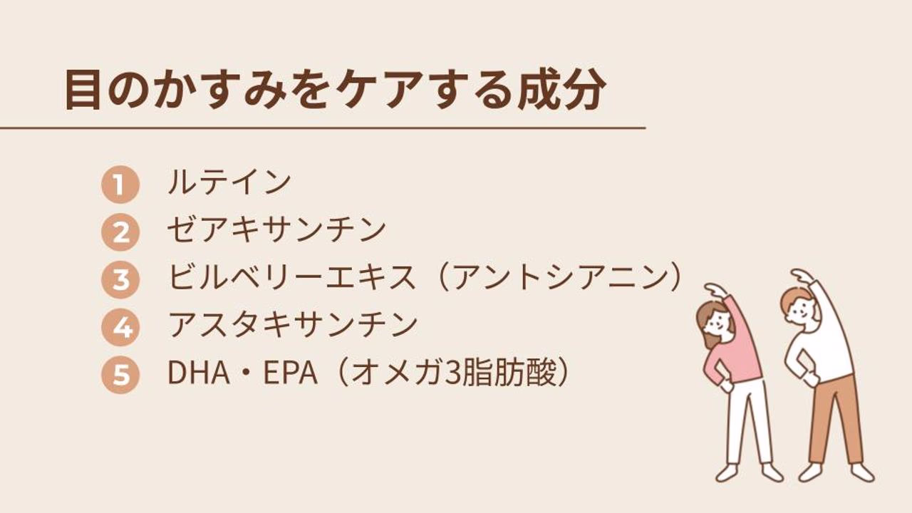 では、具体的にどのような成分が目のかすみ対策のサプリに含まれているのでしょうか。ここからは、代表的な5つの成分とその働きについて、一つひとつ見ていきましょう。