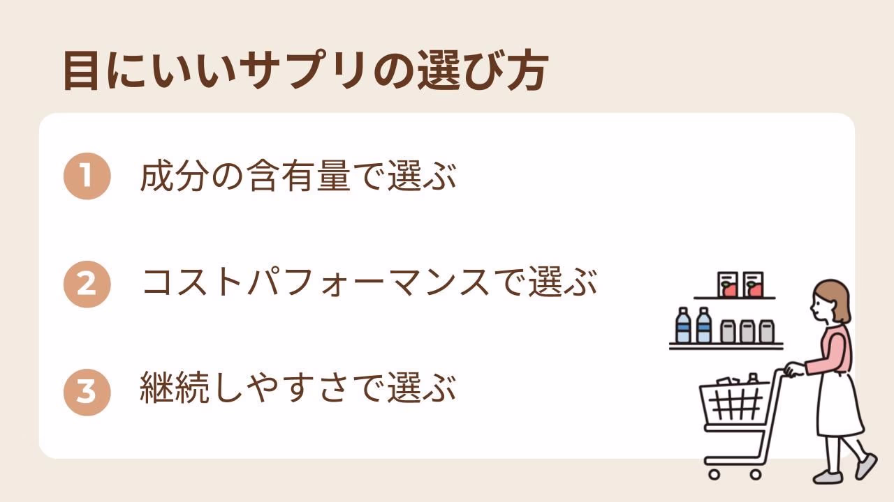 目にいいサプリを選ぶポイントは「成分の含有量」「コストパフォーマンス」「継続しやすさ」です。