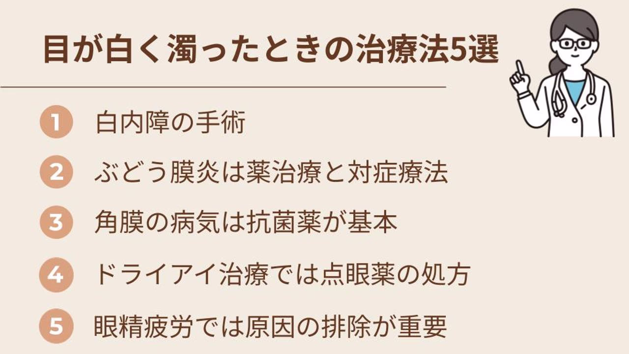 目が白く濁る原因によって、治療法は変わってきます。本記事では先ほど紹介した目が白く濁る原因に応じて、治療法を簡単に説明します。
