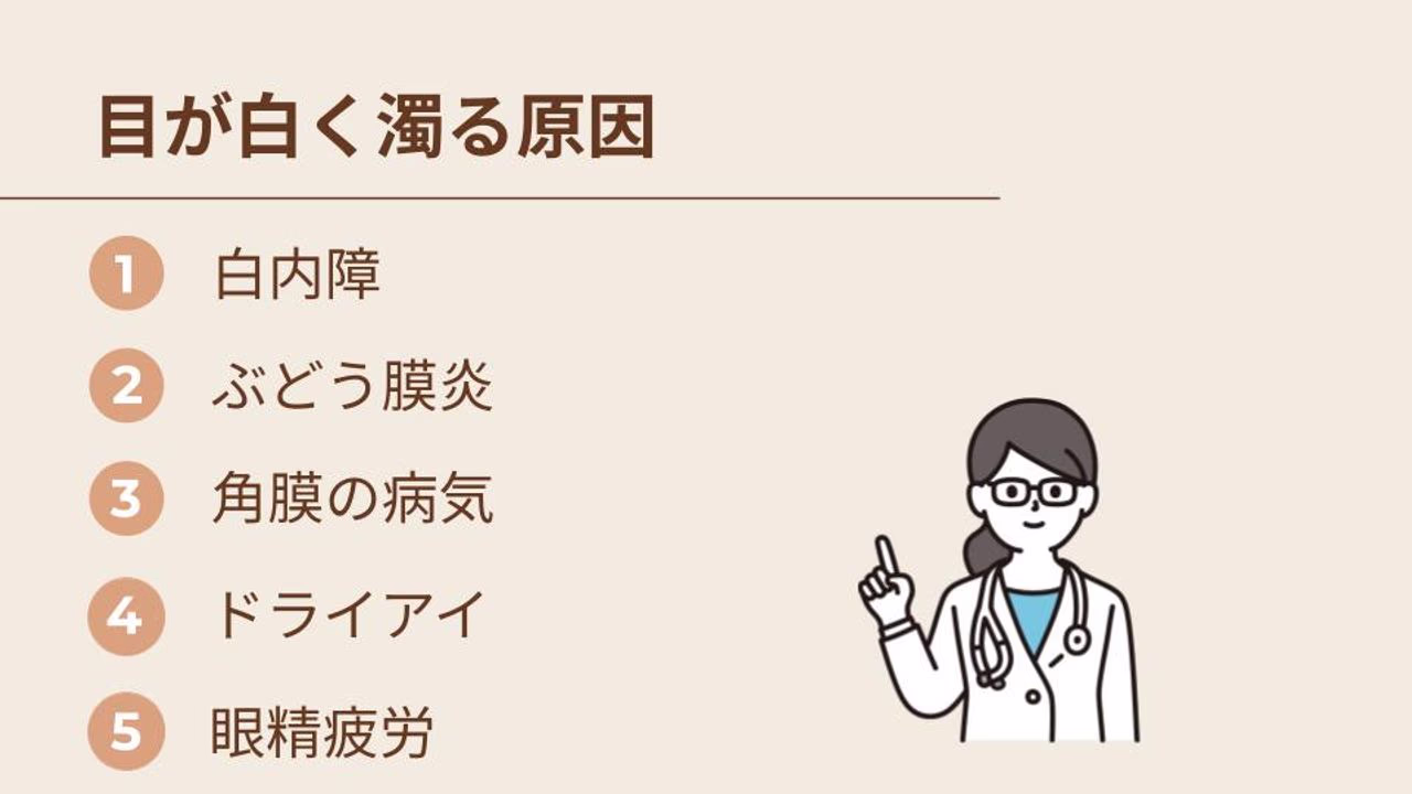 目が白く濁って見える場合、「もしかすると何か病気かもしれない」と不安に思う方もいるでしょう。