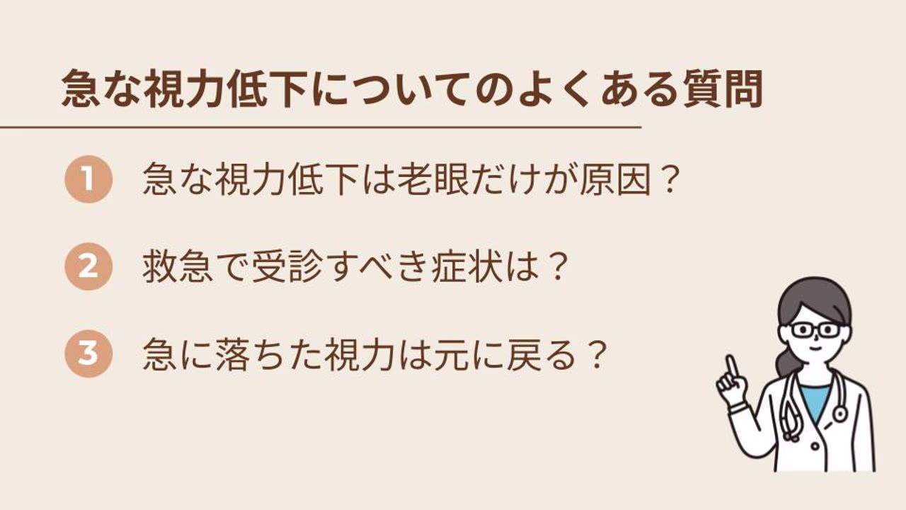 急激な視力低下や視野の異常を感じたら、年齢にかかわらず、速やかに眼科を受診して原因を特定し、適切な治療を受けることが重要です。