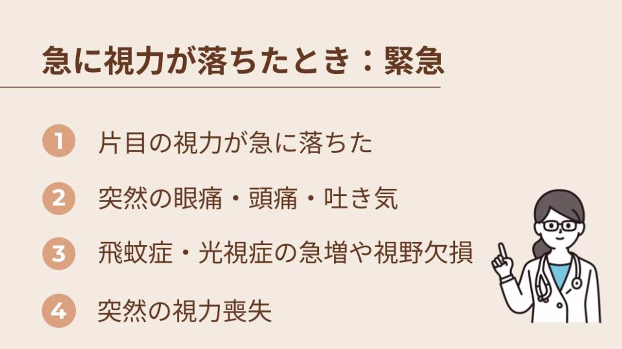 - 40代で急に視力が落ちたときの緊急サインと受診の目安