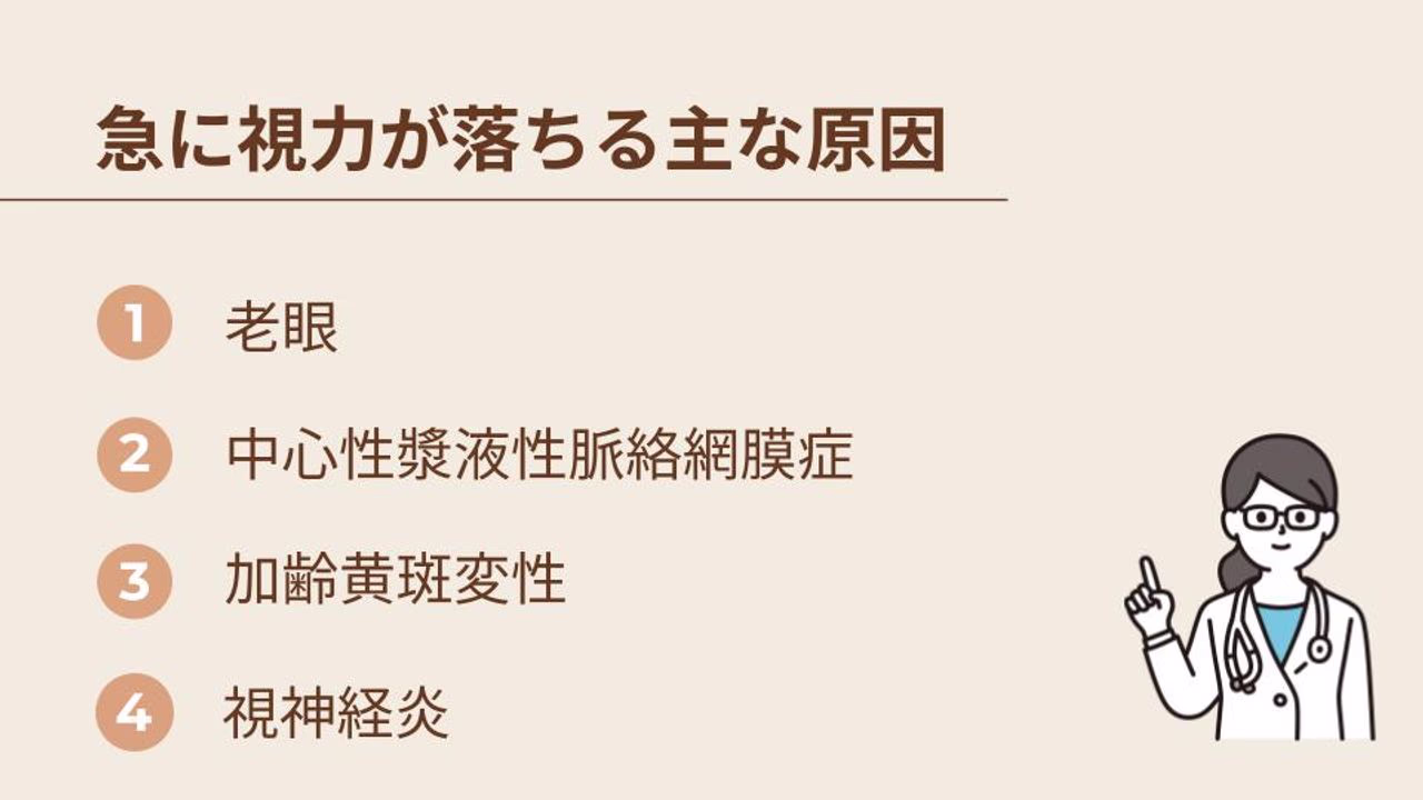 視力低下の原因には、単なる老眼だけでなく、緊急性の高い病気が隠れている可能性もあります。