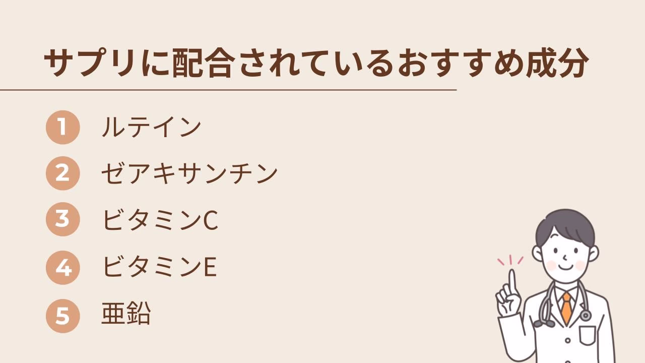 緑内障のリスクを抑えるためにも、以下5つの成分が配合されたサプリメントを選びましょう。