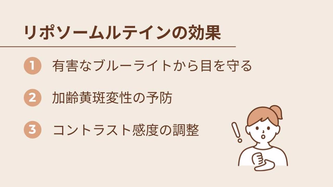 リポソームルテインは、ブルーライトを吸収し、光刺激から目を守る働きがあります。