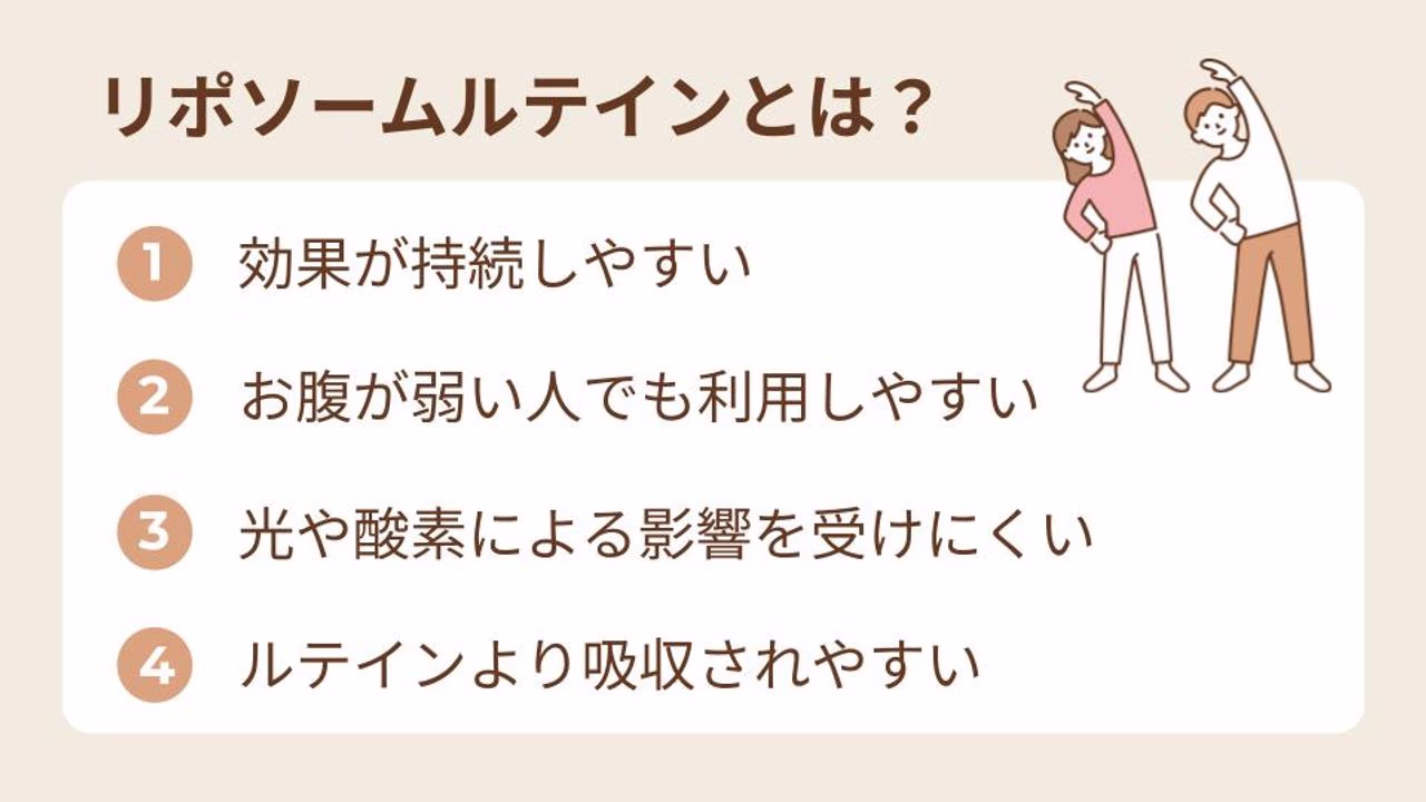 リポソームルテインは、一般的なルテインよりも体への吸収率が優れており、効果が持続しやすいのが最大の特徴です。