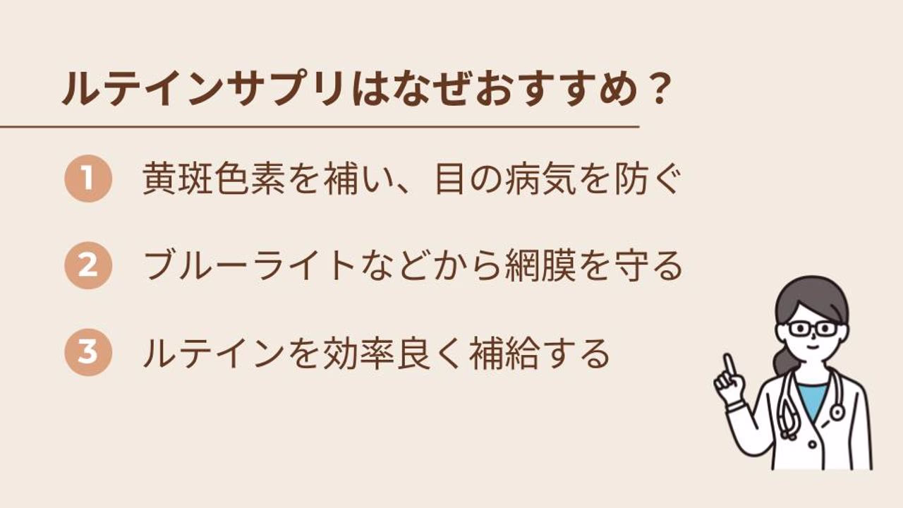 ルテインは、私たちの目の健康を守るために、なくてはならない大切な成分です。ここからは、ルテインを含むサプリがなぜおすすめなのかについて見ていきましょう。