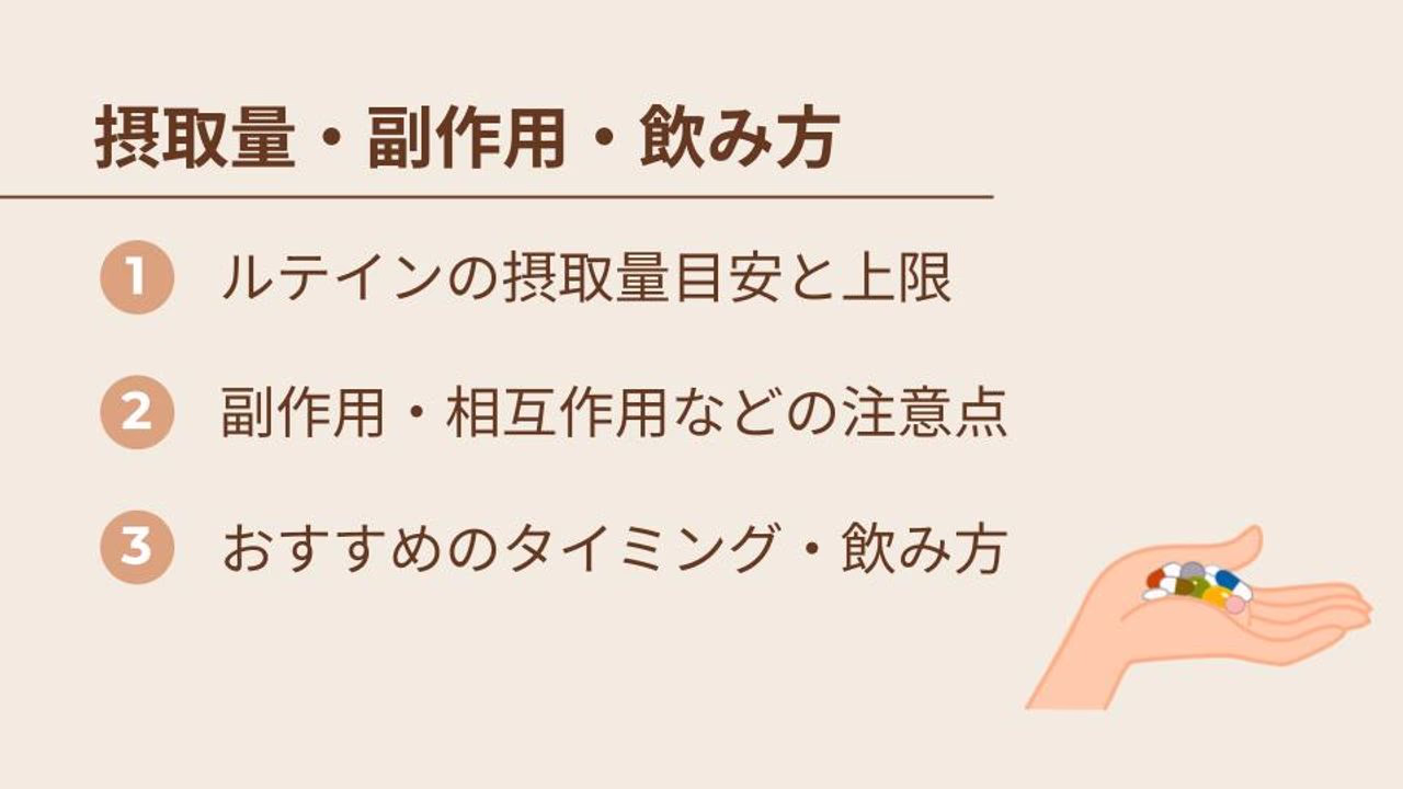 ここからは、気になるルテインサプリとの上手な付き合い方について、摂取量の目安から注意点、おすすめの飲み方まで解説していきます。