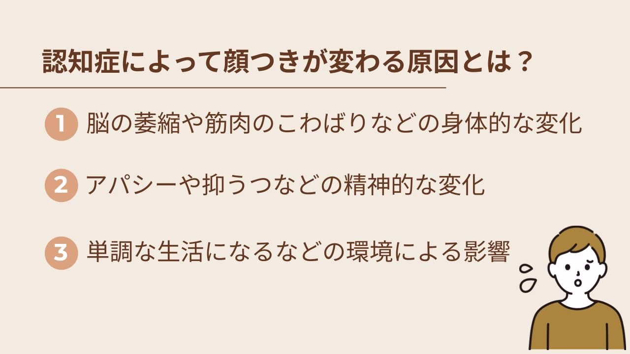 認知症によって顔つきが変わる原因はさまざまで、脳の働きが低下するなどの身体的な変化だけではありません。落ち込みやすくなるなどの精神的な変化や刺激のない生活など環境的な影響もあります。