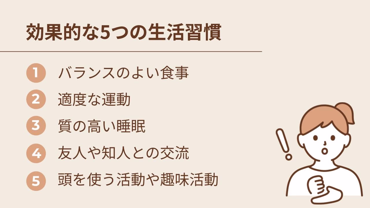 認知症の予防には、以下5つの生活習慣が効果的です。