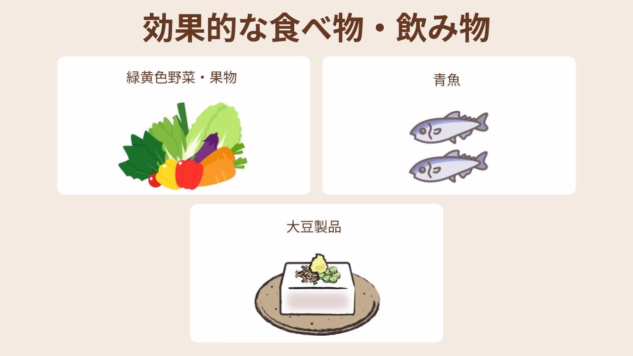 また、バランスのよい食事には緑黄色野菜や果物、青魚や大豆製品などの摂取が効果的ですが、継続して食べつづけるのは大変です。