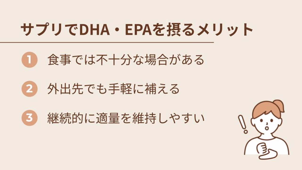 だからこそ、必要な量を手軽にかしこく摂取できるDHA・EPAサプリの活用が、多くの方におすすめされているのです。