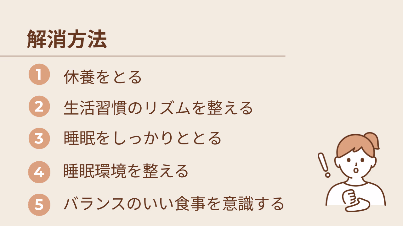原因によって対処法は異なりますが、まずは十分な休養や生活習慣の見直しを行うことが大切です。軽い運動や食事、睡眠環境の改善といった毎日の積み重ねが、心身のバランスを整える第一歩になります。
