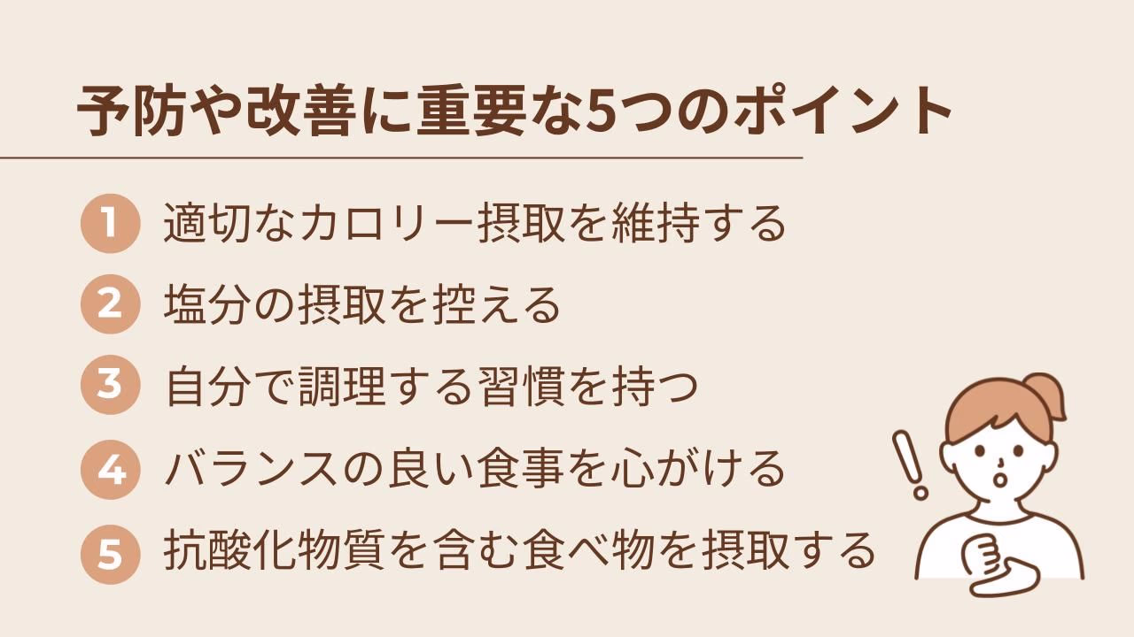 まずは、高血圧を防ぐために塩分を控えめにすることが大切です。また、1日の塩分摂取量を男性は7.5g、女性は6.5g未満に抑えるよう心がけましょう。