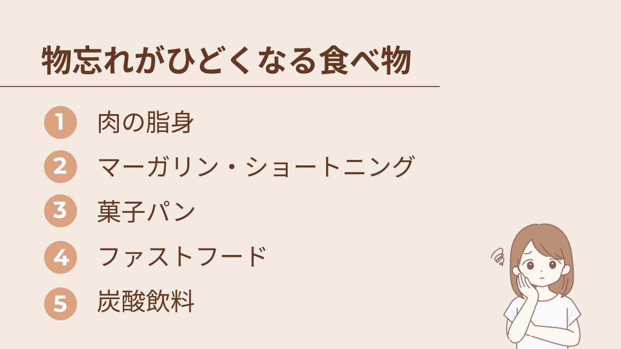 ここでは、物忘れがひどくなるといわれている食べ物を5つ紹介します。