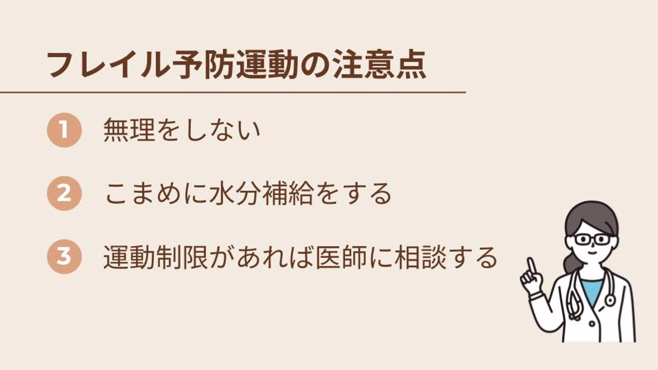 フレイル予防のために運動を始めようという意欲は素晴らしいものですが、焦りは禁物です。せっかく始めた運動で体を痛めてしまったり、体調を崩してしまっては元も子もありません。