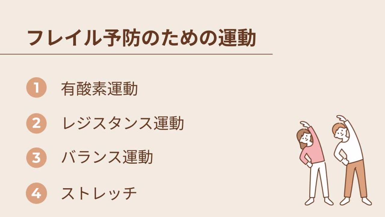 - フレイル予防のために取り入れたい運動の種類とやり方