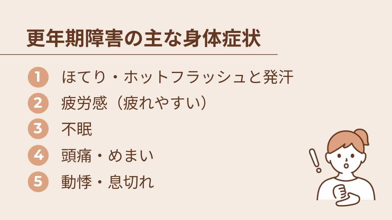 人によって症状の出方は千差万別ですが、ここでは、多くの日本人女性が経験する代表的な身体症状について、一つひとつ詳しく見ていきましょう。