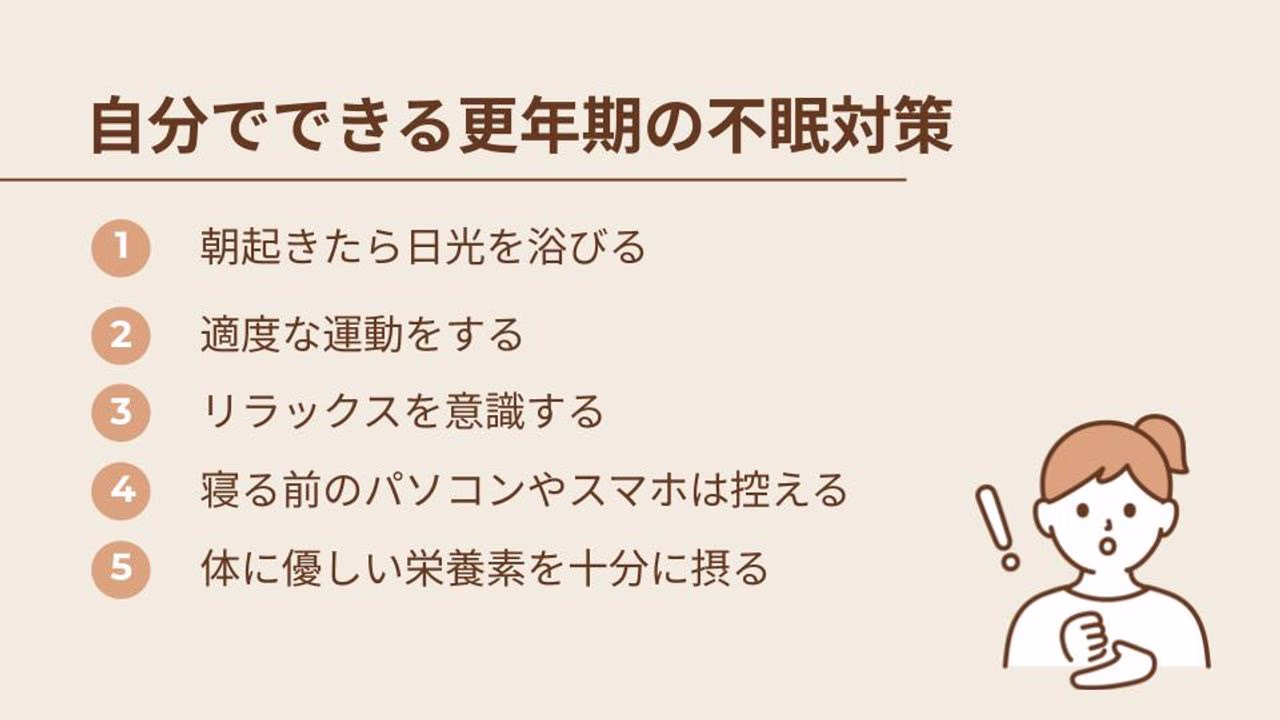 つらい更年期の不眠ですが、日常生活のちょっとした工夫で和らげることが期待できます。「もう何をしてもダメかも・・・」と諦めてしまう前に、できることから試してみましょう。