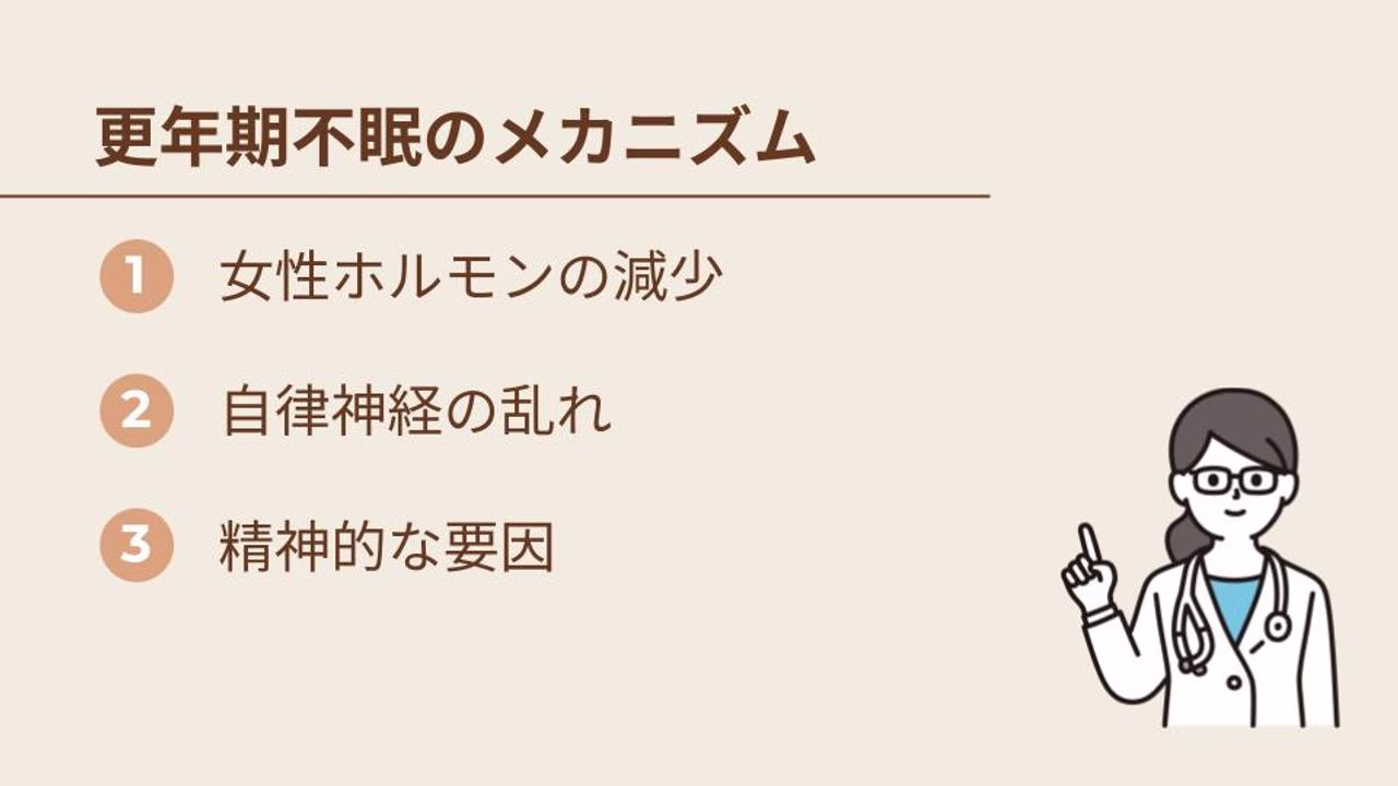ここでは、更年期の不眠を引き起こす主な3つの原因について、どのようなプロセスで睡眠に影響を与えるのかを、わかりやすく解説していきます。