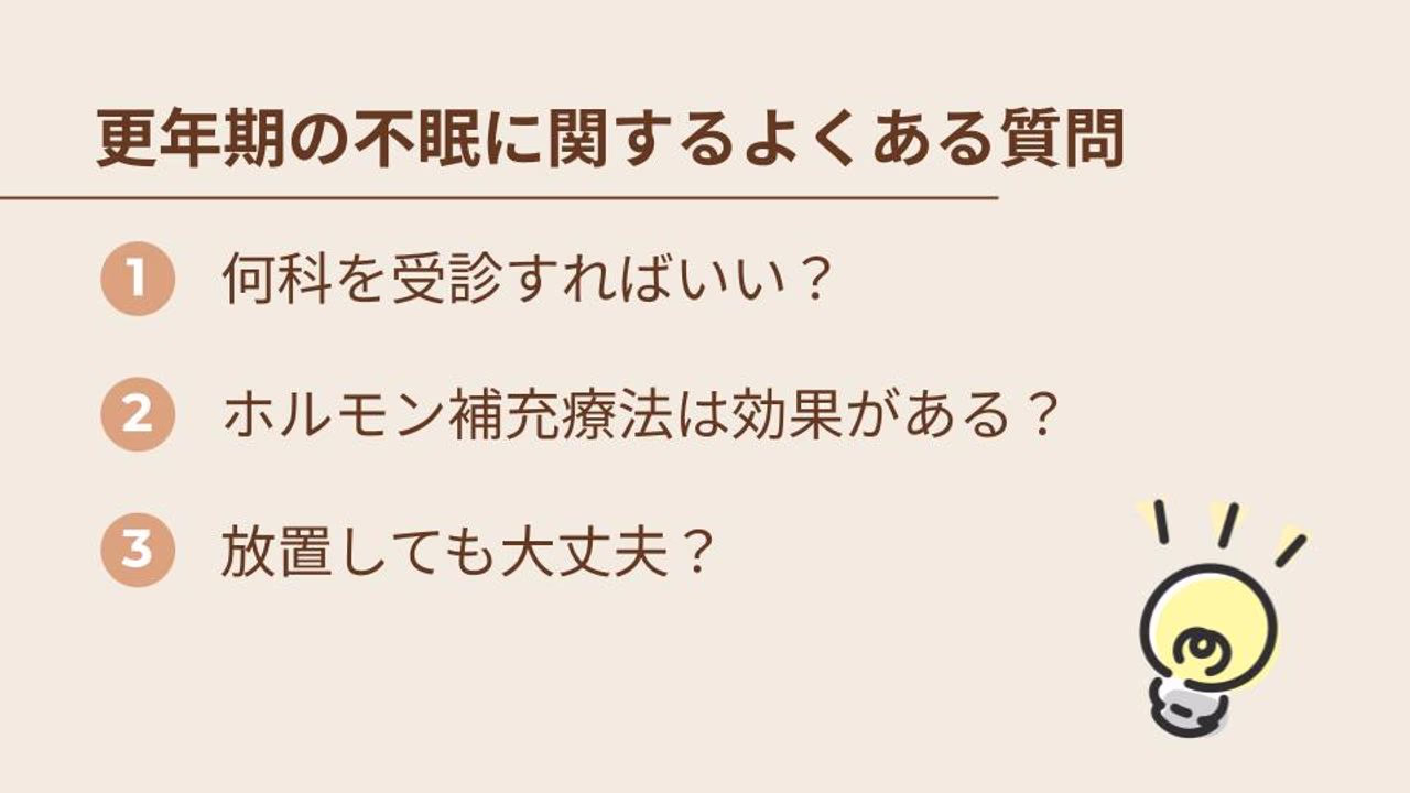 不眠の症状が続き、日常生活に支障が出ている場合は、我慢せずに医療機関に相談することをおすすめします。更年期が関係しているかもしれないと感じる場合、主に3つの選択肢が考えられます。