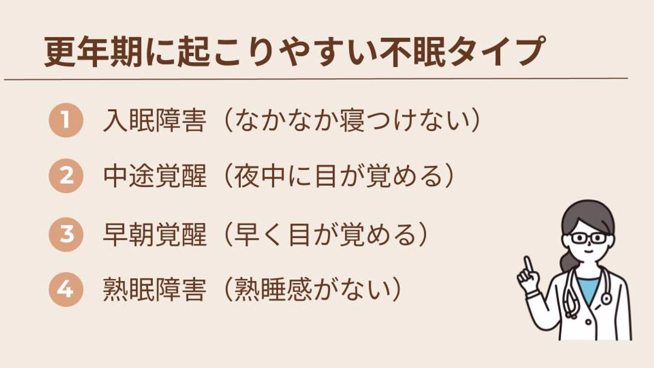 ここでは、更年期に多く見られる代表的な4つの不眠タイプについて、一つひとつ丁寧に解説していきます。