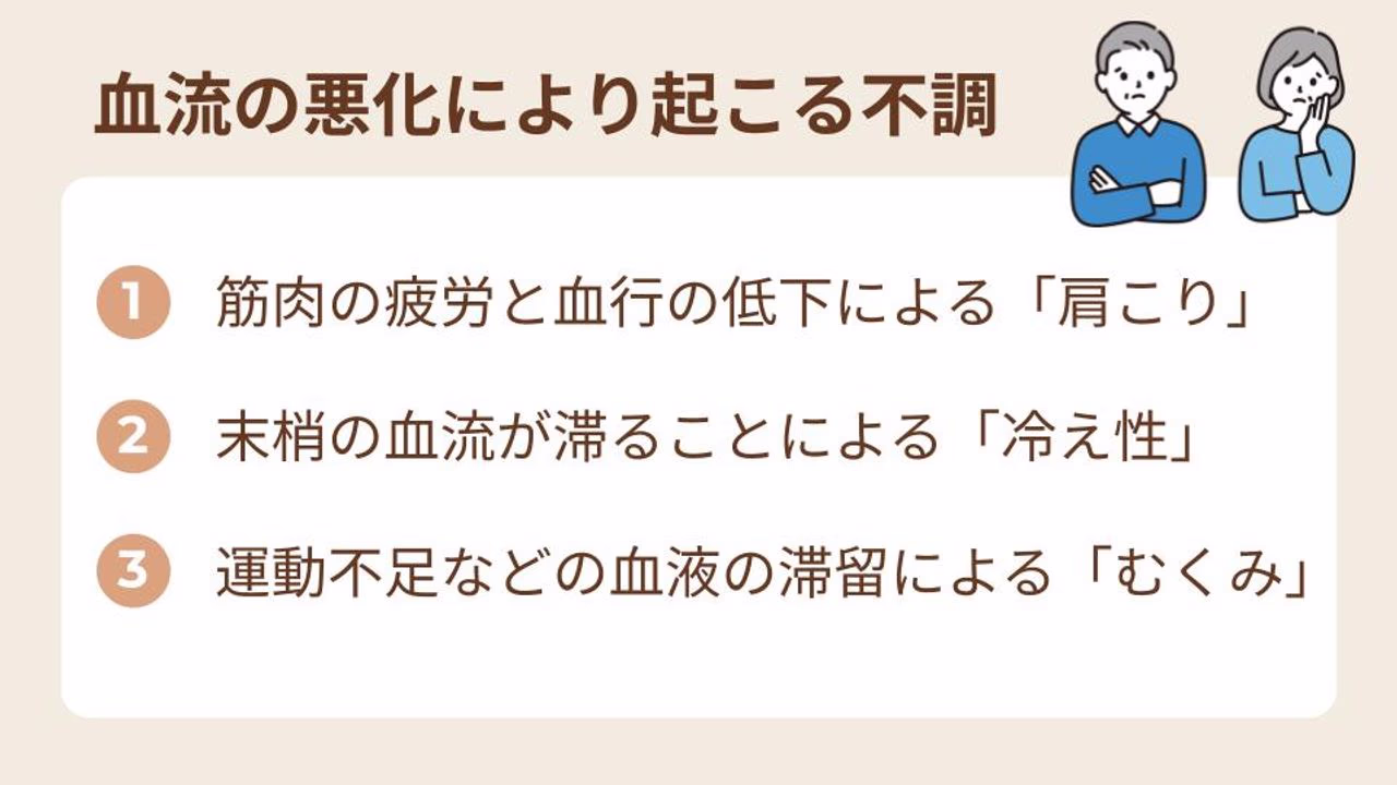 血流の悪化は、肩こりや冷え性、むくみといった体の不調につながる可能性があります。