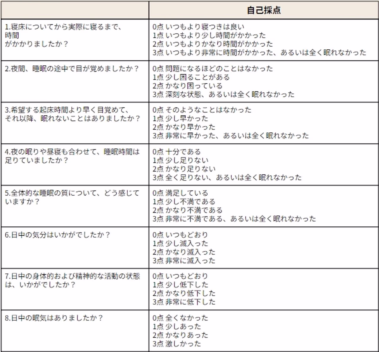 合計点数が3点以下なら問題はなく、4〜5点なら睡眠障害の可能性があり、6点以上なら睡眠障害の可能性が高いです。