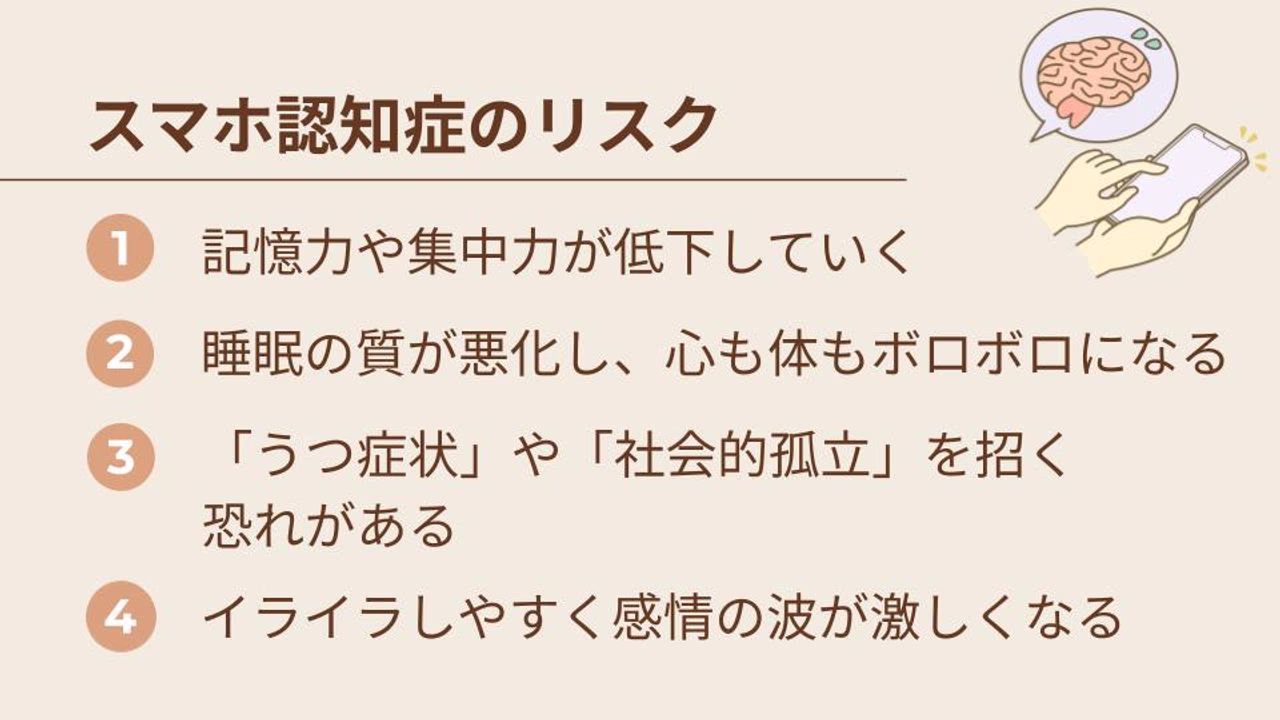こうした状態は「スマホ認知症」とも呼ばれ、一時的とはいえ認知症に似た症状が現れることから、放置すれば心身へのリスクも懸念されます。