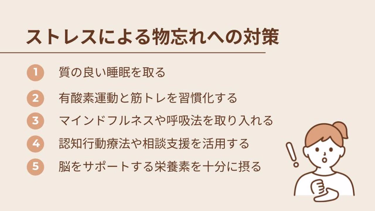 ここからは、ストレスによる物忘れに対して、ご自身で取り組める具体的な対策を5つご紹介します。ご自身のペースで、できそうなことから試してみてくださいね。