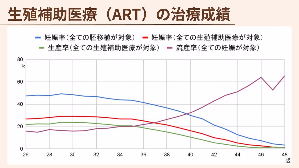 こちらは日本産科婦人科学会が発表した2021年のART(生殖補助医療)、つまり不妊治療を行った場合の妊娠率・生産率・流産率についてのグラフです。