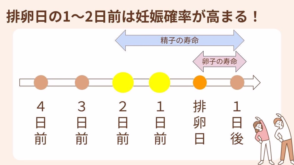 排卵日の1〜2日前のタイミングであれば、精子が膣内でまだ生きているため、卵子と出会いやすく妊娠の可能性が高まります。