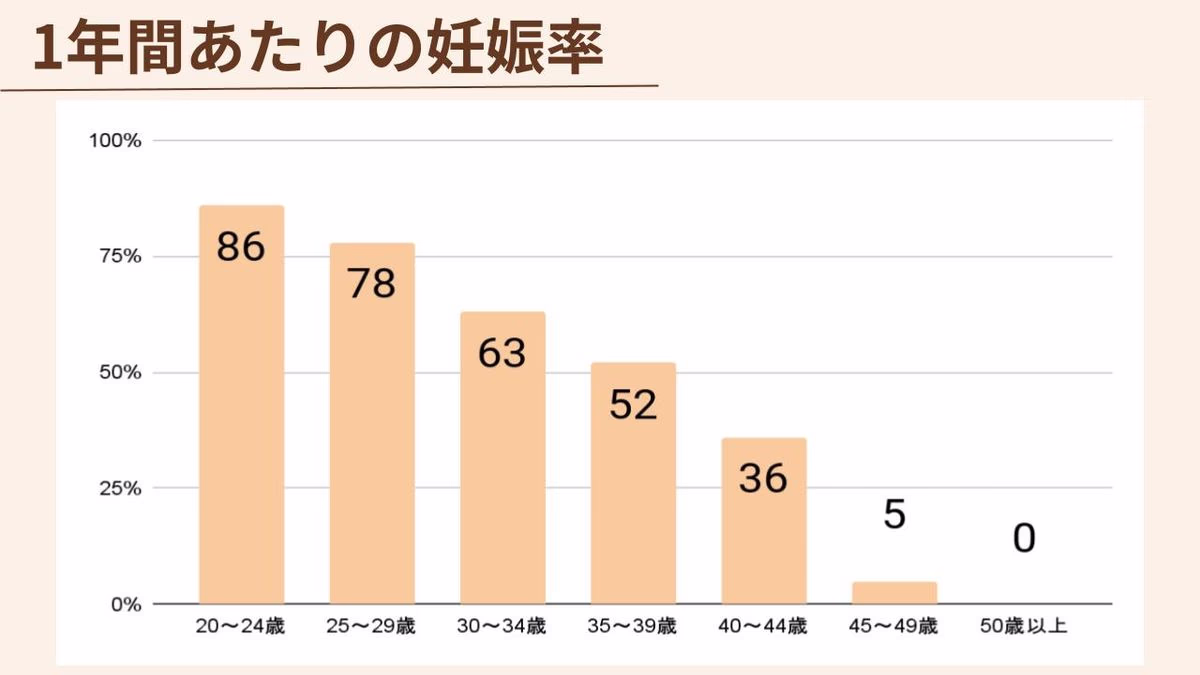 40代の妊孕力は、20代前半の50%以下になる事実からも、女性の年齢が妊娠に大きく影響するのがわかります。