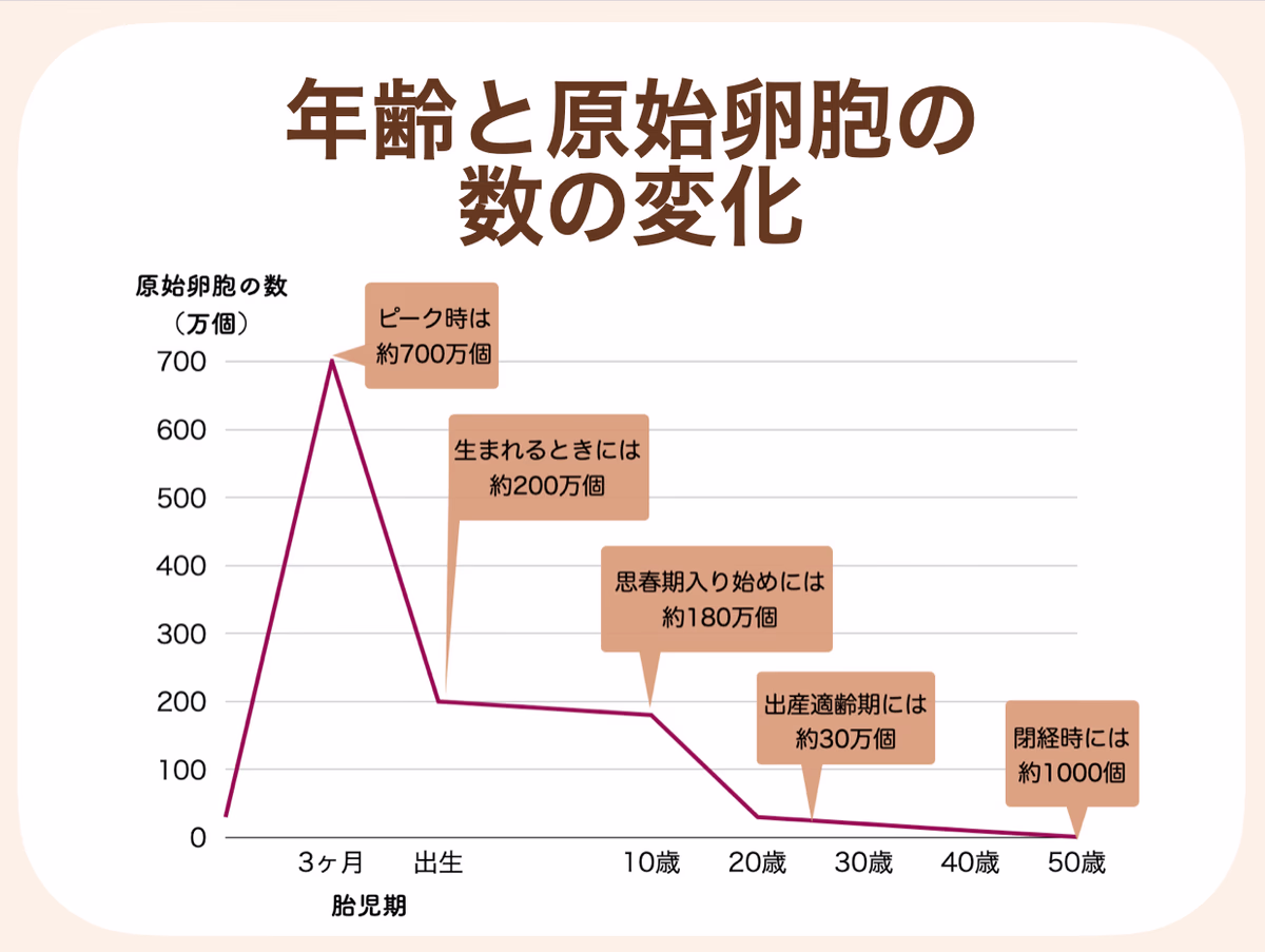 グラフをみると一目瞭然ですが、胎児期に約700万個あった卵子は年齢を重ねるとともに徐々に減少していき、出産適齢期である20代には約30万個、35歳前後には2〜3万個と減っていきます。