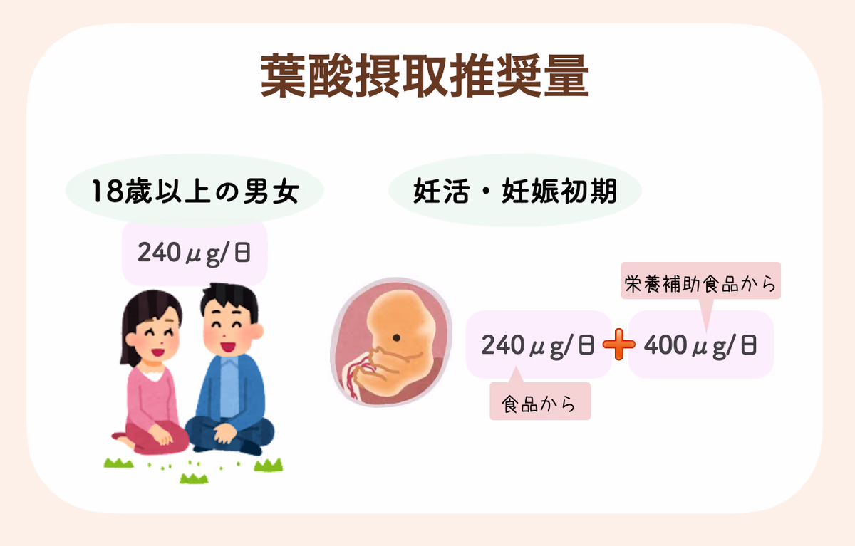 妊活中の女性の葉酸摂取は、食品から240μgに加えて、サプリメントなどの栄養補助食品から400μg摂取することが推奨されています。