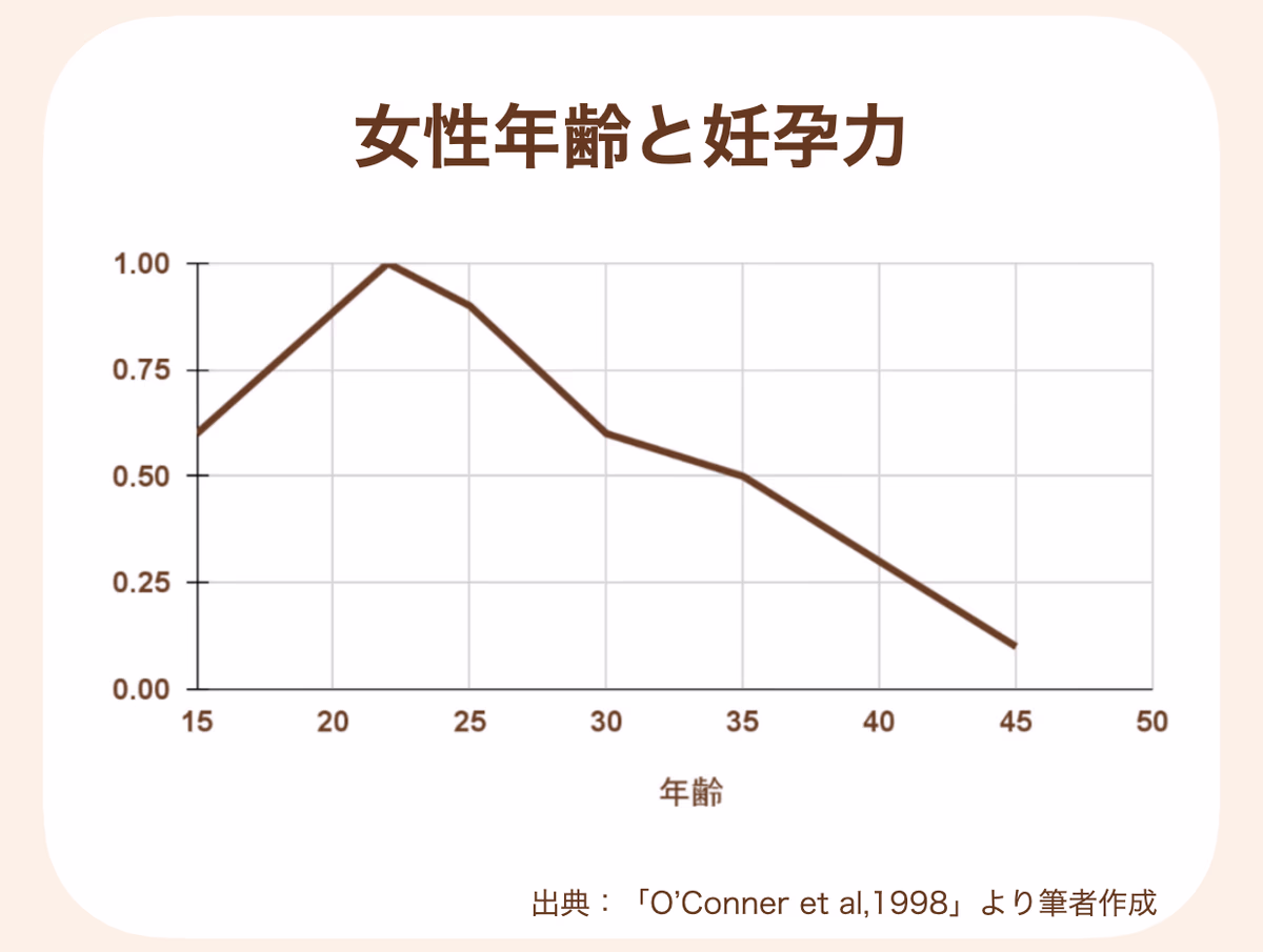 しかし、グラフを見てわかるように、女性の妊孕力(にんようりょく:妊娠できる能力)は20代半ばをピークに減少していきます。