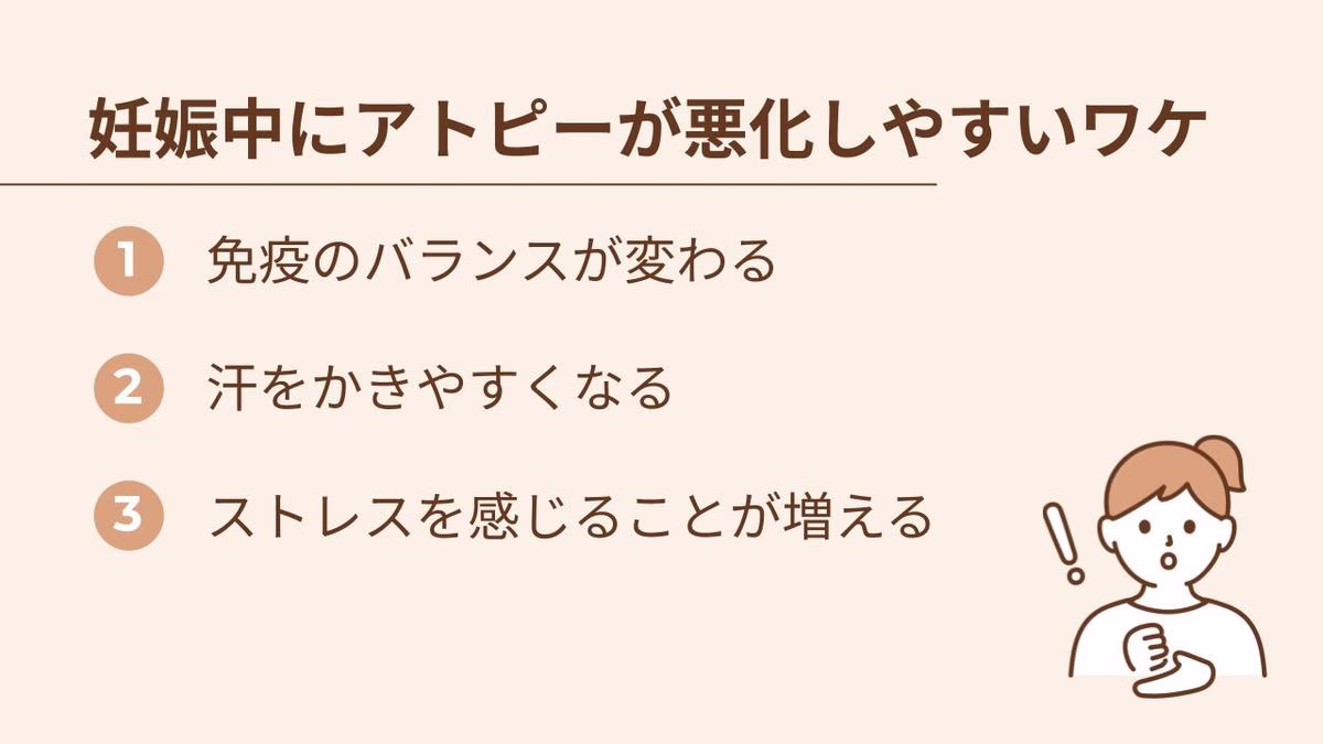 妊娠中はホルモンバランスの変化や体調の影響で、アトピーの症状が変わりやすくなります。