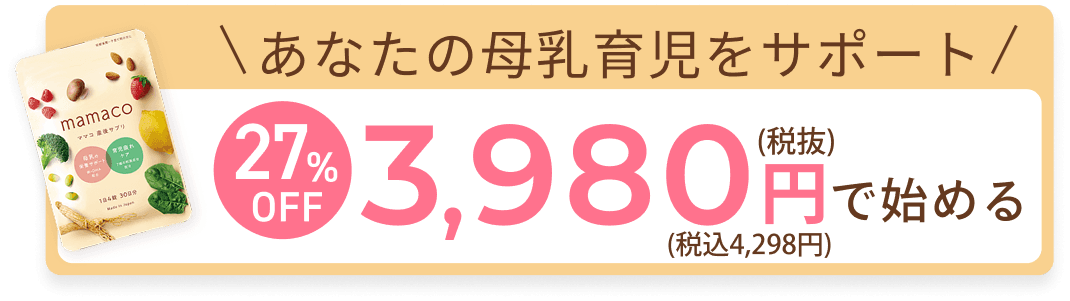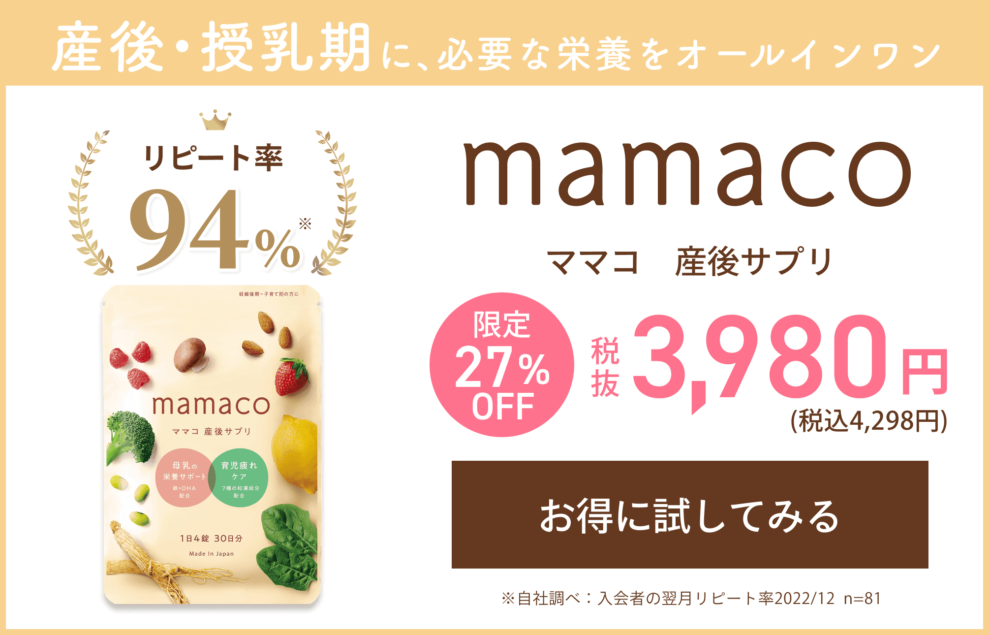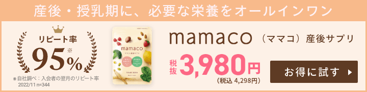 赤ちゃんがお腹いっぱい母乳を飲めているかが心配なママは、産後・授乳期のママに特化したサプリメント「mamaco」をお試しください。