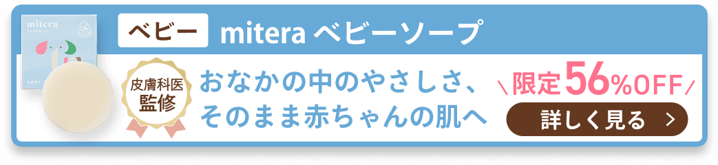 ベビーソープにもたくさん種類がありますが、おすすめはデリケートな赤ちゃんのお肌を優しくしっかり洗浄できるmitera baby soapです。mitera baby soapについてはこちらで詳しく紹介しています。