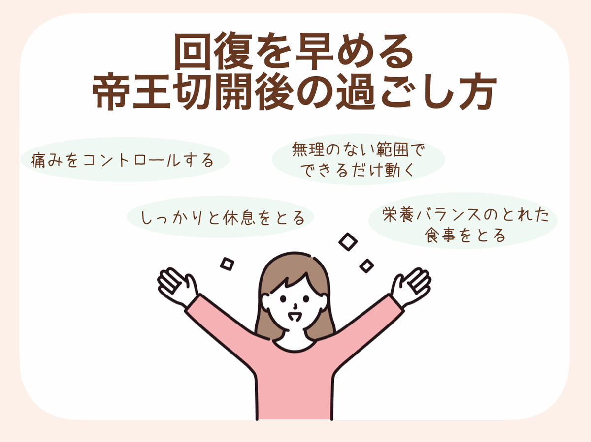 帝王切開後は、痛みをコントロールしてできるだけ早い時期から動くことが早期回復のポイントになります。
