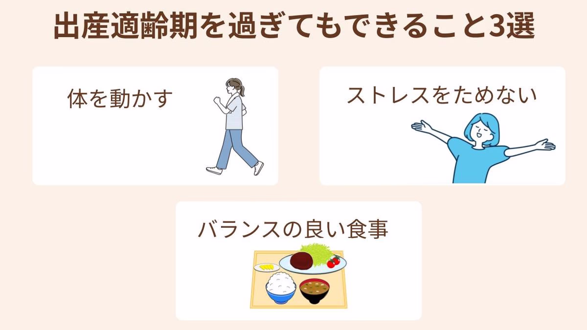 しかし、適齢期を過ぎてもできることはあるので、焦らなくても大丈夫。まずはストレスをためずに、適度な運動やバランスのよい食事を心掛けることが大切です。