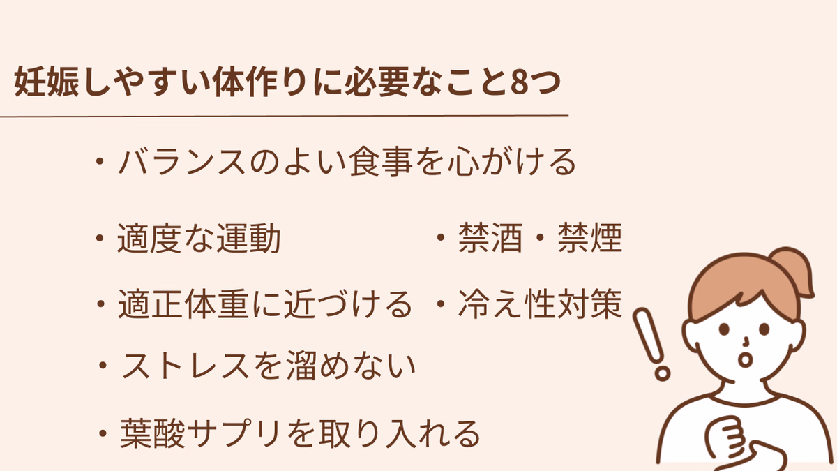 ここからお伝えする「妊娠しやすい体作りに必要なこと8つ」は、日常生活に取り入れていけるものを集めています。