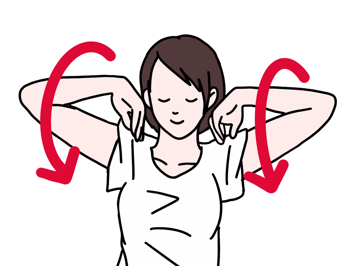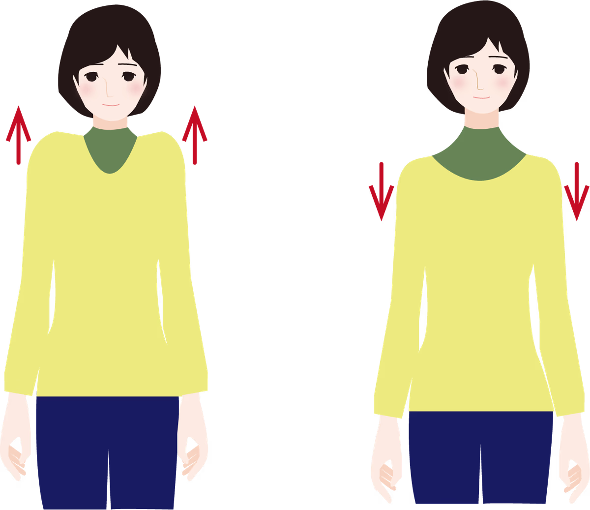 - 肩を上げた状態で少し後ろに肩を引いて、息を吐くのと同時にすとんと肩を下げる