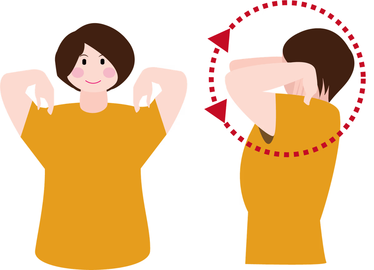 - 両手の指先を肩先にくっつけて、肩を中心に肘を大きく回す