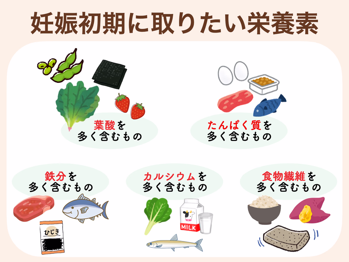 妊娠初期はバランスの良い食生活を基本に、葉酸、たんぱく質、鉄分、カルシウム、食物繊維を特に意識して摂りましょう。