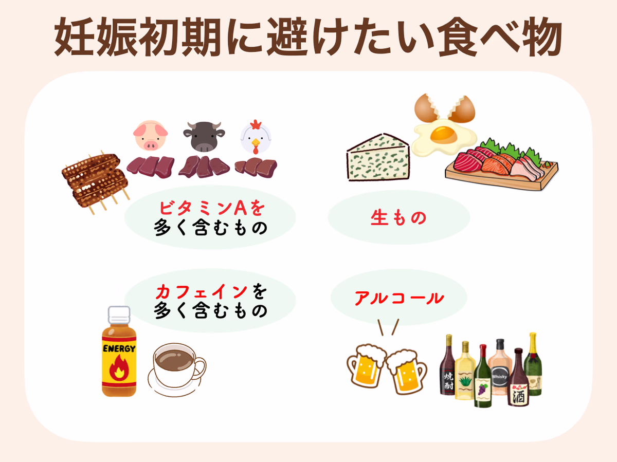 ここまで紹介してきたものとは反対に、妊娠初期に避けたい成分と食べ物は「ビタミンA」「生もの」「カフェイン」「アルコール」です。避けたい理由と具体的な食べ物を紹介していきます。
