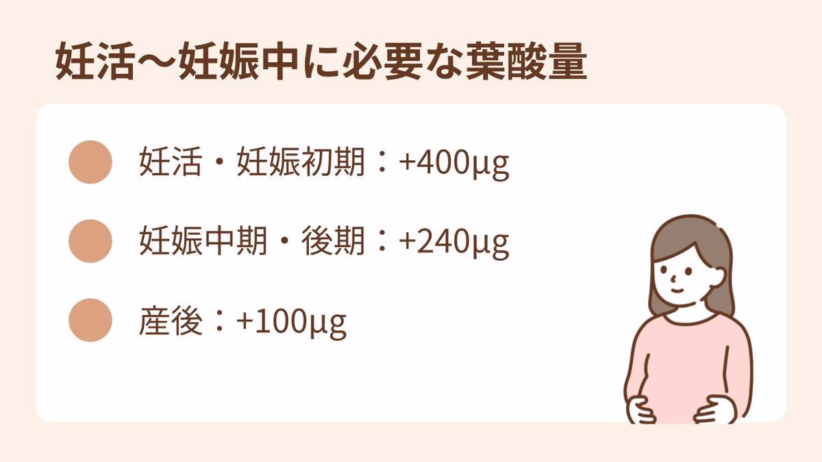 妊娠前から産後まで長い期間必要な葉酸は、それぞれの時期で働きが少しずつ変わります。